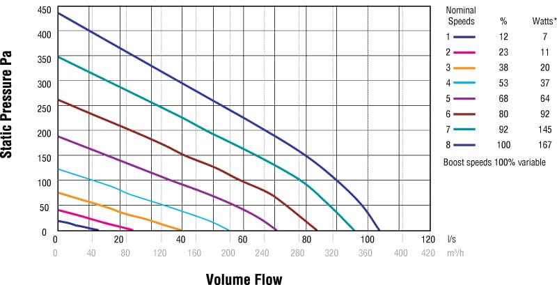 • Extremely low Specific Fan Power; down to 0.54 W/l/s