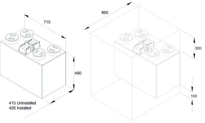 Dimensions: 715mm wide x 490mm high (excluding ports) x 415mm deep (426mm with mounting bracket).